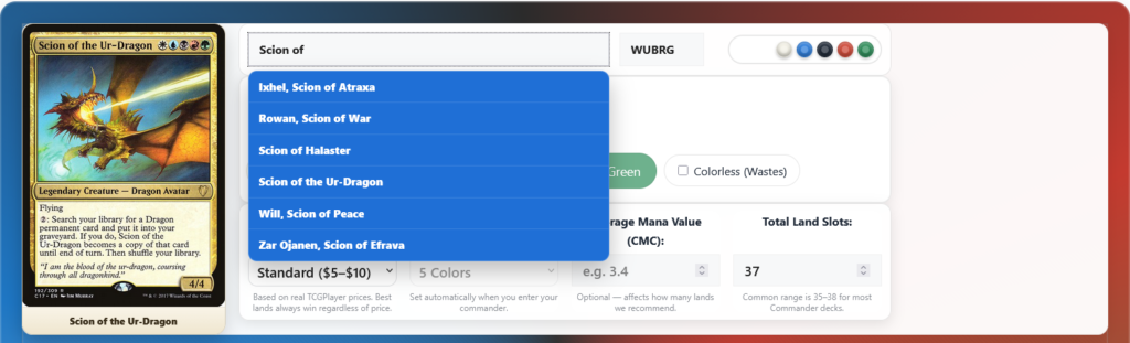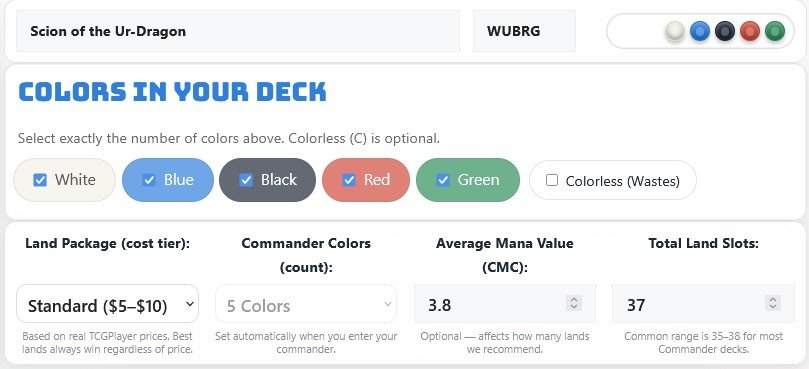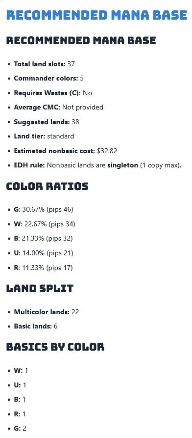 By looking at your commander, average mana cost, color intensity, and how demanding your spells are, it recommends a land breakdown that matches how your deck really plays — so you can cast spells on curve, hit your colors reliably, and stop losing games to your opening hand.